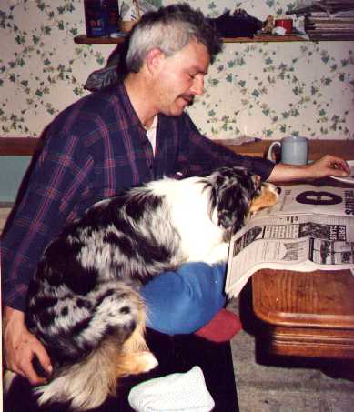 Fortunately, our Aussies can relate to our family on several different levels... from "find the kids," "bring the shoes," "clean up" (Dots' specialty), "catch the (snow) ball," "snuggle up,"...as well as all the usual Aussie antics. And in Dad and Dots' special relationship? - sharing supper, sharing the chair AND the newspaper .